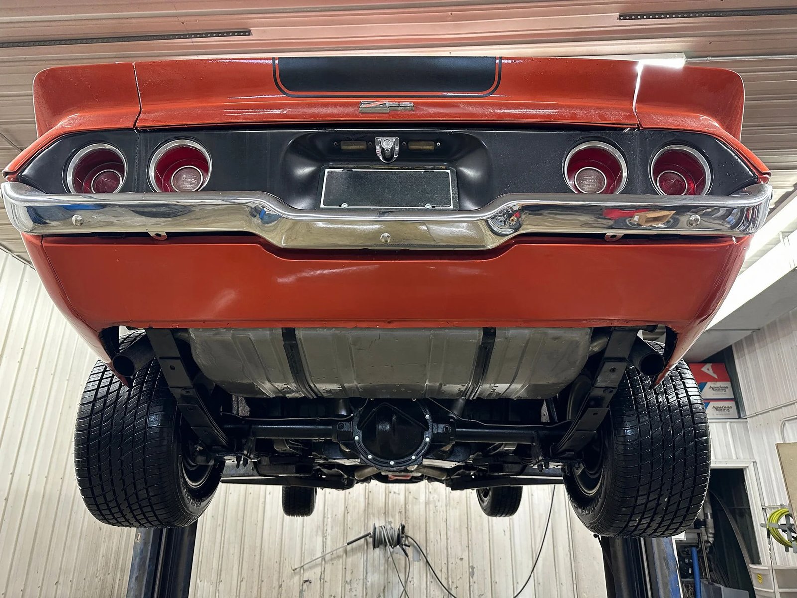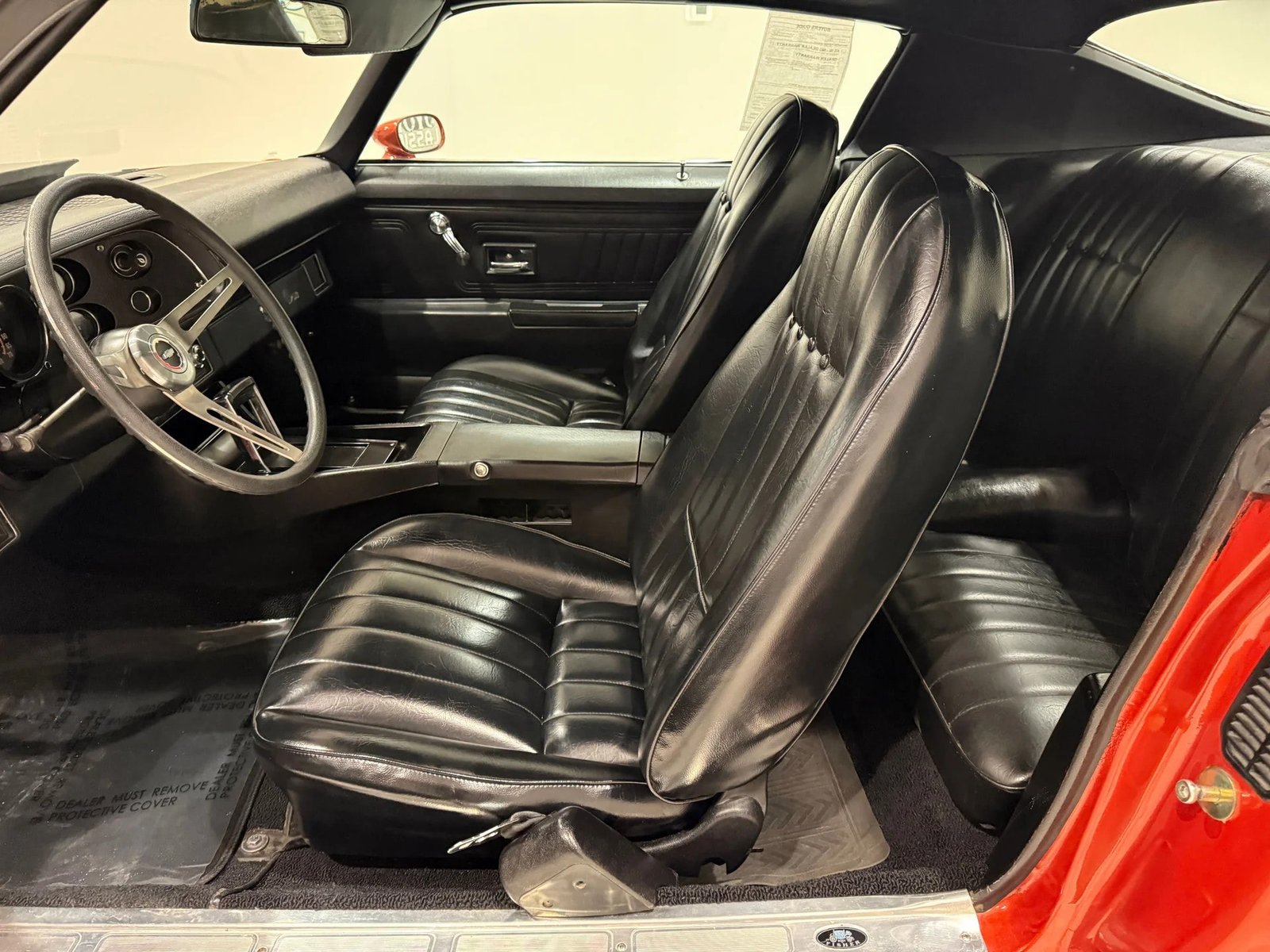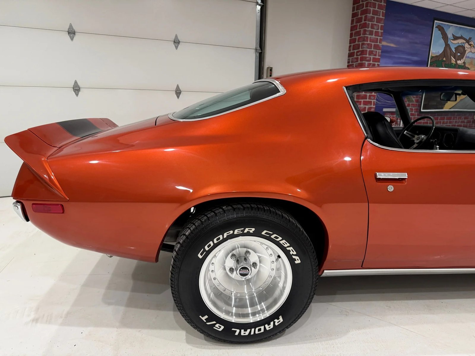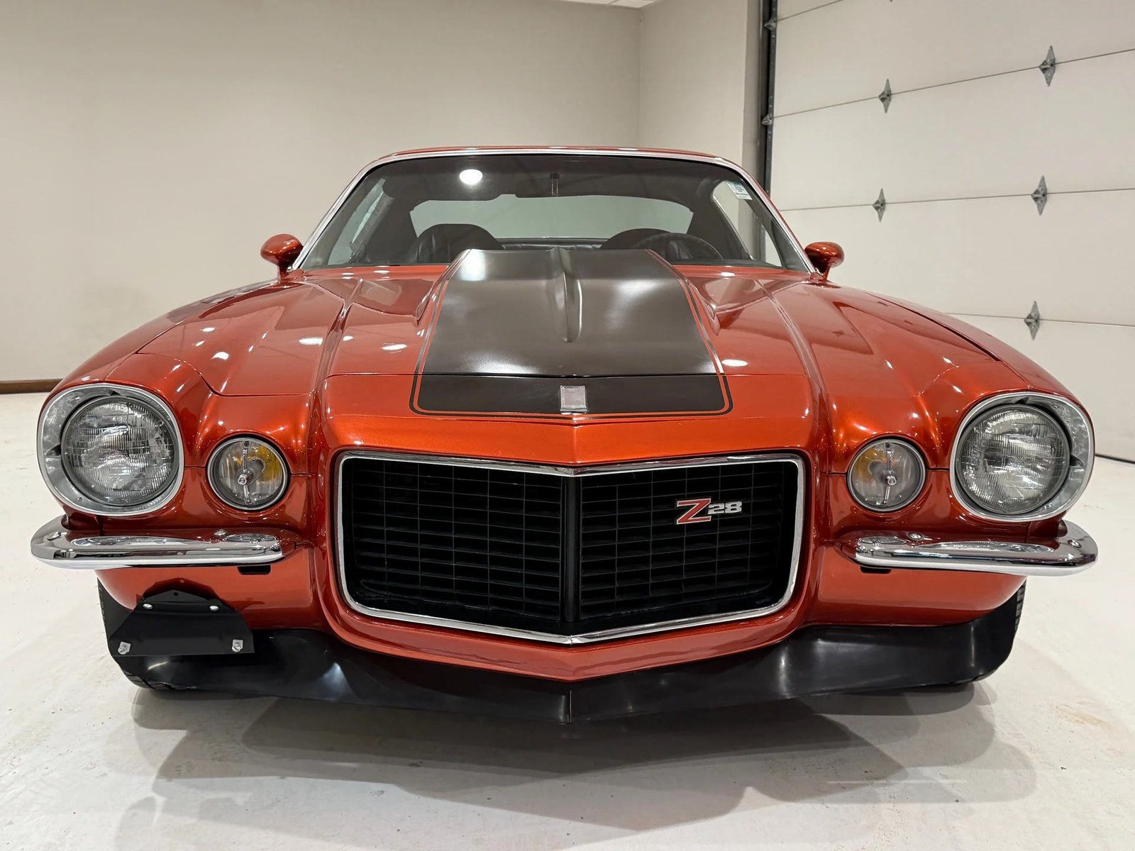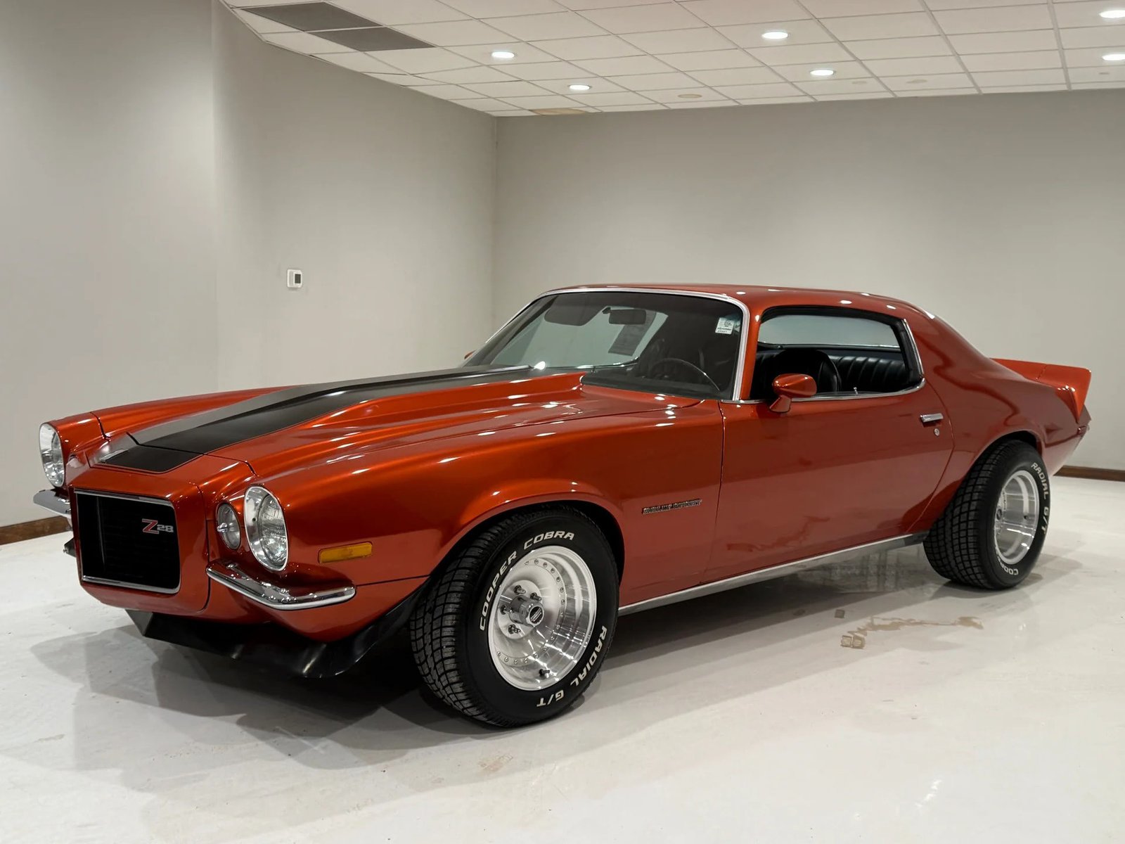 This nice-looking 1971 Camaro features the Rally Sport split-bumper front end and Z28 trim. It is powered by a 350ci V8 with headers and dual exhaust, paired with a 350 automatic transmission and a 10-bolt Posi rear end. The exterior is finished in Sunset Orange with black Z28 stripes and a cowl hood, riding on staggered American Racing wheels. The black interior includes bucket seats, a full console with horseshoe shifter, factory tachometer, and an AM/FM digital radio.